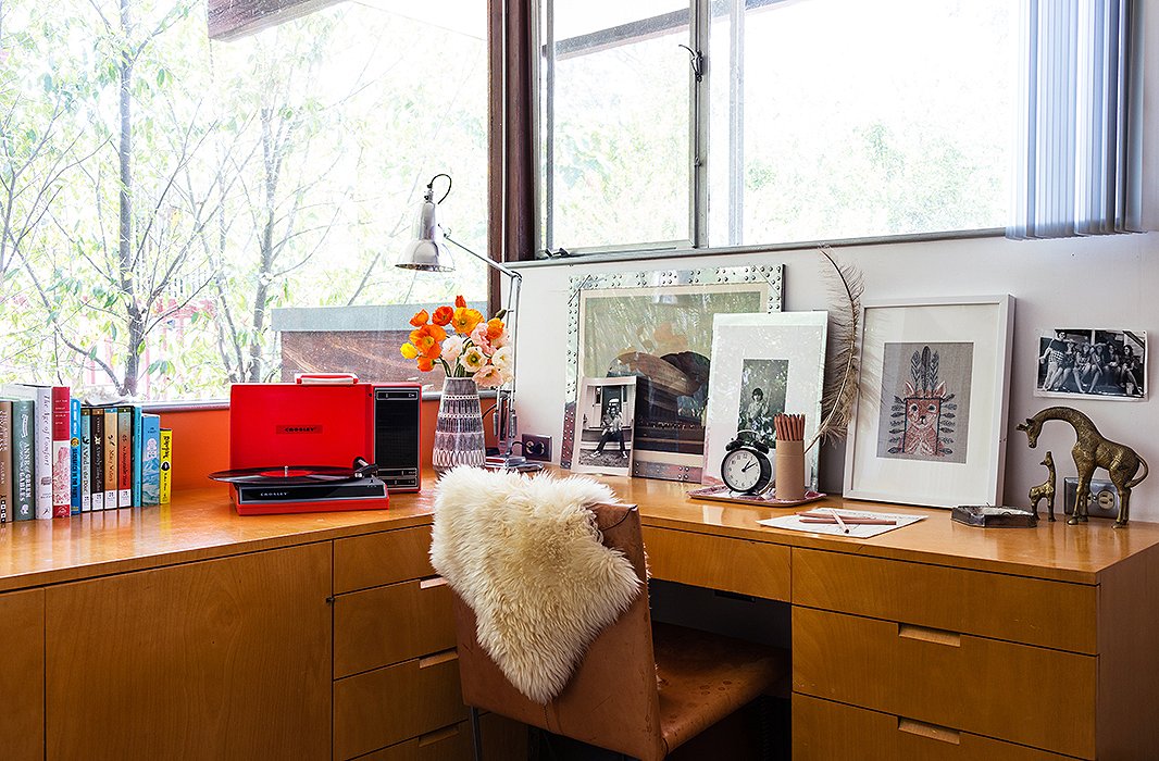 Warm corner window workspace.